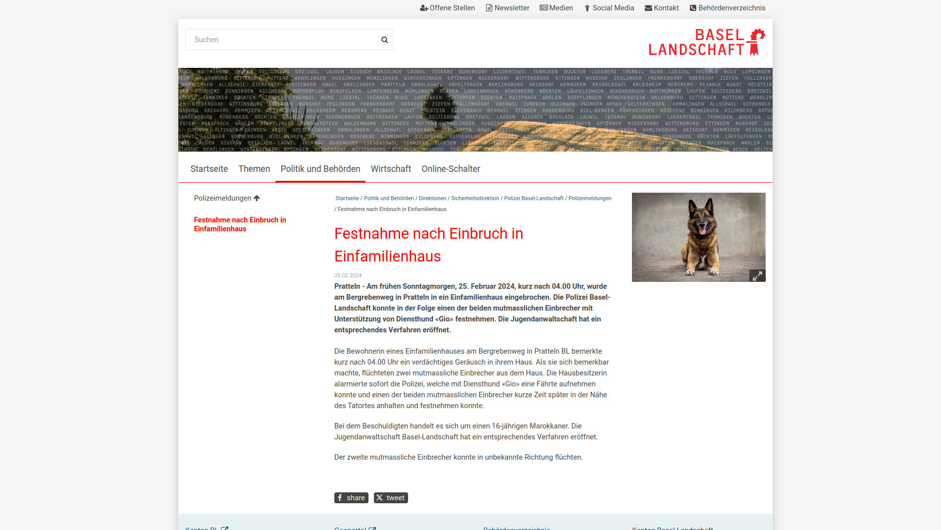 Am frühen Sonntagmorgen, 25. Februar 2024, kurz nach 04.00 Uhr, wurde am Bergrebenweg in Pratteln in ein Einfamilienhaus eingebrochen. Die Polizei Basel-Landschaft konnte in der Folge einen der beiden mutmasslichen Einbrecher mit Unterstützung von Diensthund «Gio» festnehmen. Die Jugendanwaltschaft hat ein entsprechendes Verfahren eröffnet.