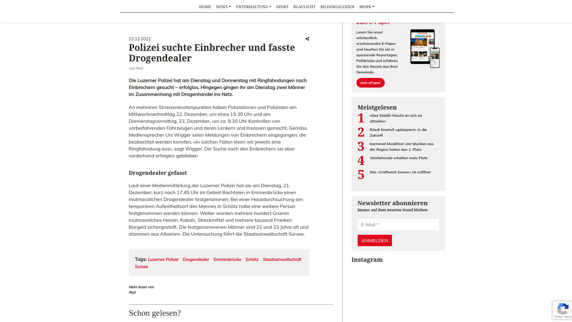 Die Luzerner Polizei hat am Dienstag und Donnerstag mit Ringfahndungen nach Einbrechern gesucht – erfolglos. Hingegen gingen ihr am Dienstag zwei Männer im Zusammenhang mit Drogenhandel ins Netz. Laut einer Medienmitteilung der Luzerner Polizei hat sie am Dienstag, 21. Dezember, kurz nach 17.45 Uhr im Gebiet Bachtalen in Emmenbrücke einen mutmasslichen Drogendealer festgenommen. Bei einer Hausdurchsuchung am temporären Aufenthaltsort des Mannes in Schötz habe eine weitere Person festgenommen werden können.