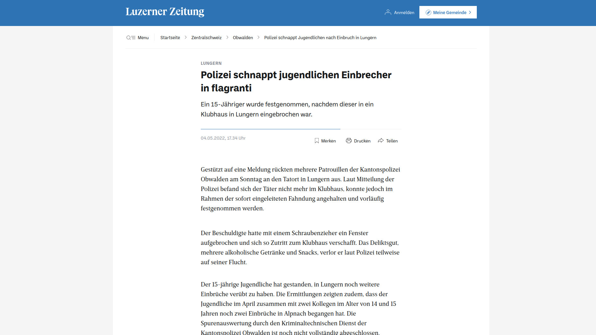 Ein 15-Jähriger wurde festgenommen, nachdem dieser in ein Klubhaus in Lungern eingebrochen war. Gestützt auf eine Meldung rückten mehrere Patrouillen der Kantonspolizei Obwalden am Sonntag an den Tatort in Lungern aus. Laut Mitteilung der Polizei befand sich der Täter nicht mehr im Klubhaus, konnte jedoch im Rahmen der sofort eingeleiteten Fahndung angehalten und vorläufig festgenommen werden.