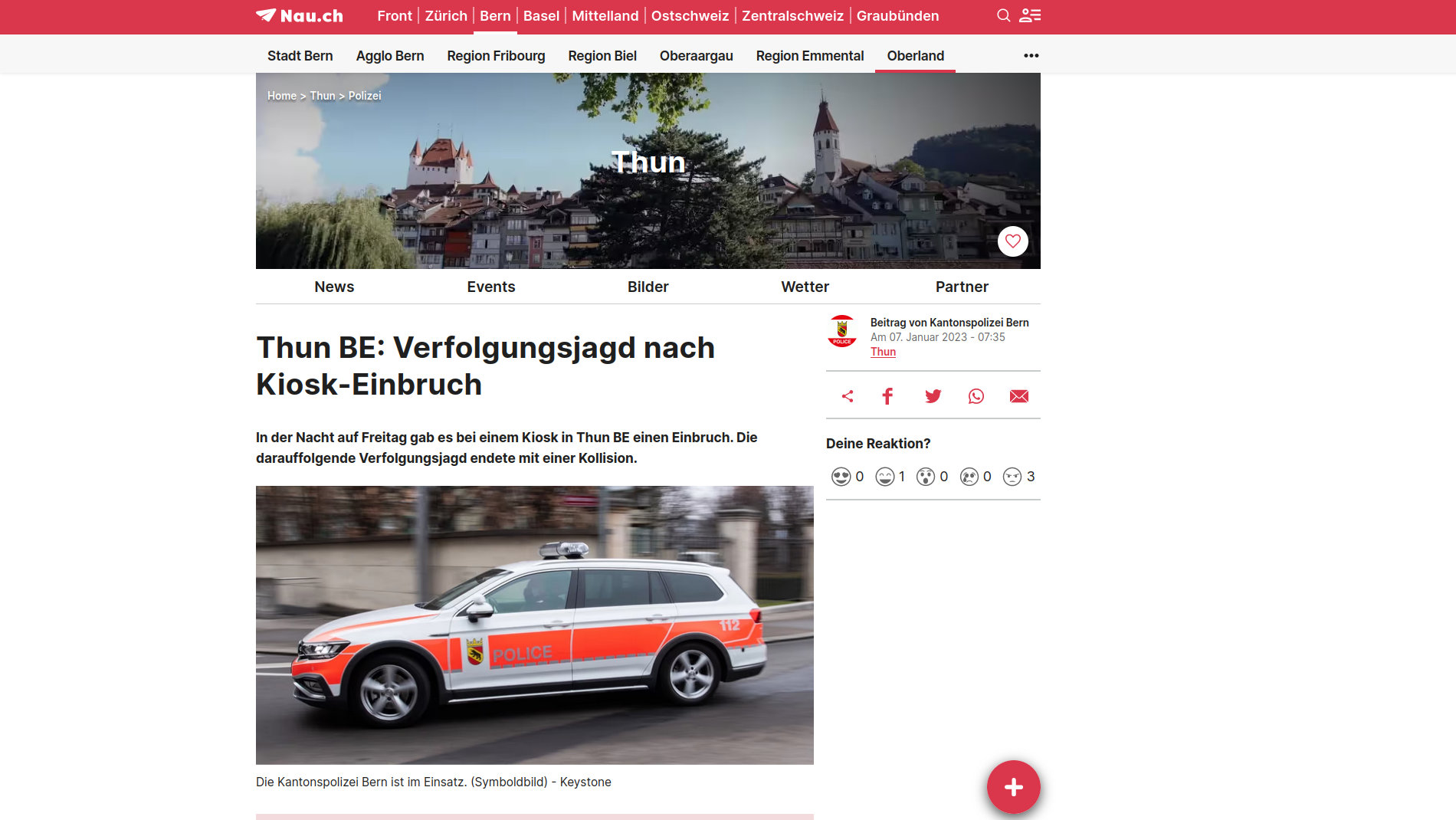 In der Nacht auf Freitag gab es bei einem Kiosk in Thun BE einen Einbruch. Die darauffolgende Verfolgungsjagd endete mit einer Kollision.